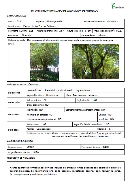 El Ayuntamiento de Salteras nos adjudicó la Evaluación de Riesgo de varias especies de su municipio. En una primera fase se han analizado el estado y la valoración del riesgo de 100 ejemplares de Ulmus pumila localizados en el Parque de los Poetas, Parque del Chorrito y la calle Juan XXIII del municipio de Salteras. La segunda ha consistido en evaluar de forma individual la estabilidad y seguridad de los ejemplares de Ulmus pumila, Melia azedarach y Phoenix dactylifera en diferentes localizaciones del municipio.